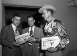 Early registrants for the annual state convention of the Junior Chamber of Commerce were, left to right, George Etz and Al Brandt, both from Sweetwater, Texas, and John W. Rhodes, of Fort Worth, Texas, far right. Rhodes is holding a stack of newspapers (The Jaycee Journal) and is handing one to Etz. The journal is published by the Fort Worth Jaycees (Fort Worth Junior Chamber of Commerce members). Etz and Brandt are wearing suits and Rhodes is wearing a western shirt, bandanna, trousers and a cowboy hat.
