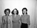 Euless High School Senior class play actors (from left) Mary Ruth Hall, Reta Jean Millican and Mrs. Guy Moore Junior, social science teacher. The actors are standing against a blank wall. Miss Hall is wearing a gingham print overcoat, Miss Millican is wearing a dress and Mrs. Moore is wearing a blouse and skirt.