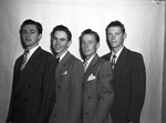 Euless High School Senior class play actors (from left) James Berry, James Martin, Billy Fuller and John Hurt. The actors are standing against a blank wall, all wearing suits.