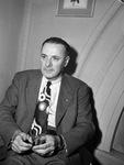 W. D. Whalen, of McAllen, Texas, Kiwanis governor of the Texas-Oklahoma District. He is sitting in a chair, wearing a suit and holding a pair of eyeglasses in his hands. There is a painting hanging in the wall behind him.