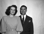Mr. and Mrs. W. R. Defibaugh, recently married. Mrs. Degibaugh is the former Miss LaVerne Atwood. The newlyweds are standing in front of a blank wall. Mr. Defibaugh is wearing a suit and the bride is wearing a dress and a pearl necklace.
