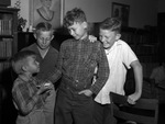 Richard Tomascik (center) treating his buddies Carl Wayne Jones, who is holding the last of four dozen sweet rolls, Merrill Houston (left) and Cecil Littlejohn. The boys are gathered in a living room. Richard and Carl are wearing plaid shirts and trousers and Merrill and Cecil are wearing solid colored shirts and trousers.