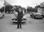 Elmer Doggett, salesman for Cap Phillips, used car dealer, looking baffled after a car had been stolen by a prospective customer. Doggett is standing outdoors in front of the dealership car lot. He is wearing a suit.