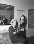 Actor Don DeFore with actress Gale Storm from Houston, Texas. DeFore is sitting on a couch, wearing a suit, as Miss Storm stands next to him and adjusts his hat.