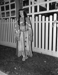 Lora Dell Harwood, dressed in Native American clothing, to sing and play the violin in the "Footlite Revue of 1947." She is standing in front of a picket fence.