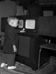 Earl C. Smith Junior, 2 1/2, trying to tune a television set at the Texas Electric Show. He is wearing a coat and trousers.