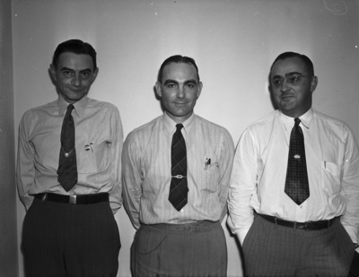 Stanolind Oil and Gas Company recently promoted employees include (left to right) J. G. Crosskill, R. E. Graham and John J. McCrea. All three are standing and are wearing dress shirts and neckties.