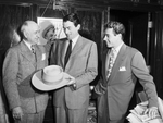 Standing left to right: Amon Carter, Gregory Peck and Guy Madison. They are all wearing suits. Peck is holding a hat. In the background is a framed photograph of Will Rogers and a stack of newspapers on a table.