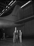 Left to right, I. M. Laddon, Gill Robb Wilson, and Roland Mayer, under the tail of the B-36 at Convair.