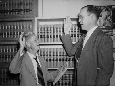These two kept a four-year-old date Wednesday when Associate Justice Brown, of the Second Court of Civil Appeals, left, administered the attorney's oath to Police Sergeant Joe Warren Rice. They made the date when Rice, then a traffic policeman, began studying law at night in 1936. He received his license last week. The two stand in front of several shelves filled with volume of "South Western Reporter."