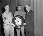 Polytechnic High School R. O. T. C. rifle team, winner of 5-state 4th Army area William Randolph Hearst trophy in national rifle shoot, presented to Principal C.A. Thompson (right), Cadet Charles A. Hamilton, team captain (left) and Sergeant A. Miller, coach.