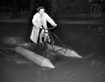 Grace Halsell is shown riding a watercycle on the pond at Forest Park. The watercycle was invented by William Hamilton. Published in The Fort Worth Star-Telegram Evening Edition May 12, 1947.