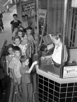 Larry Lemons buying ticket from Miss Shirley Menefee, Tivoli Cashier, for a Baby Elephant fund benefit show. Behind him are Gene Shilling, Jo An Taylor, Iola Brothers, Bobbie Jean Bryant and Jerry Lemons.