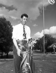 Golf Colonial National Invitation Tournament participant Henry Picard, Cleveland, holding golf bag.