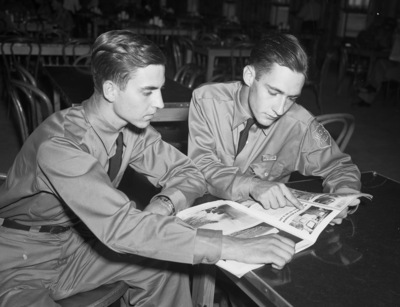 Left to right, R. A. Oliphant Junior and C. H. Davidson, flying cadets at Hick field. The former's home is in Chester, South Carolina and the latter comes from Scott Field,Illinois. Fort Worth Star-Telegram Morning Edition. 1940-08-15. Photograph of two young men, sitting at a table looking at a book together. They are flight cadets dressed in military uniforms.