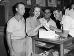 Anne Feris, Colonial Country Club secretary, checking mail for professional golfers (from left) Jimmy Demaret, Toney Penna and Freddie Hass at the Colonial National Invitation Tournament.