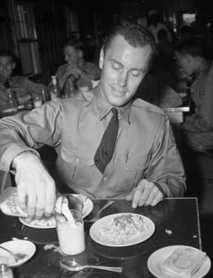 Arthur Hughes, first cadet at Hick field to solo; he is from Ridgewood. New Jersey. Fort Worth Star-Telegram Morning Edition. 1940-08-15. Photograph of Arthur Hughes, a young cadet at Hicks Field. He is seated at a table in the mess hall eating.