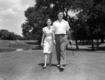 Mrs. Chick Harbert accompanying her golfer husband as he practices at the Colonial National Invitation Tournament.