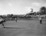 Ben Hogan shooting a long, curving putt while George Schoux leans on a putter and looks on at the Colonial National Invitation Tournament.