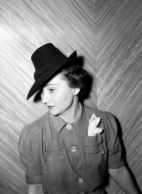 Miss Kathryn Fry, modeling a pompadour beret. Miss Fry is shown standing in front of a wall, looking off to her right. She is also wearing a dress with a handkerchief in the left breast pocket.