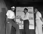 Golfers (from left) Ellsworth Vines, George Schneiter and Fred Haas Junior, looking over the scoreboard at the Colonial National Invitation Tournament.