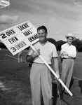 Jimmy Demaret holding score sign at the Colonial National Invitation Tournament.