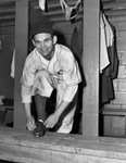 Fort Worth Cats baseball player David Pluss tying his shoe.