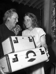 Fort Worth Women's City Golf Tournament's Mrs. R. E. Winger (left) and Polly Riley, receiving luggage set.