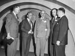 Standing left to right: R. L. Bowen, of Fort Worth, Texas, E. M. Donaldson, of the Royal Air Force, Amon Carter, L. Welch Pogue, of Washington, D. C., and Milton Reynolds, of Chicago, Illinois, attending the Aeronautic Association Convention at the Blackstone Hotel. In the background is a mural painted on the wall. Mr. Reynolds is holding a book in his hand, at his side.