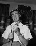 Golfer L.D. Hardin looking at his ball and club at close range.