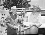 Retiring fireman. Amon Carter and John L. Whittenburg, retiring North Side battalion chief of the fire department. Mr. Whittenburg is showing Mr., Carter some of the instruments, equipments, and tools he used as a fireman , Mr., Carter is wearing a suit and a tie while Mr. Whittenburg is wearing a long sleeve shirt and pants with the sleeves folded.