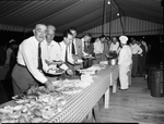 Party at Shady Oak for visiting members of Aviation Writers Association. A group of men all dressed in business attires are standing in line at a table serving their food from the variety of option on the buffet table. There are chefs standing behind the table to provide any assistance they may need.