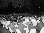 Party at Shady Oak for visiting members of Aviation Writers Association. This picture shows an overview of the guest present at the Aviation Writers Association party at Shady Oaks. They are seated at table enjoying their meals while they listen to someone speak from the front table.