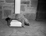 Photograph of 45-pound turtle that was presented to Forest Park Zoo by Marvin Leggett, after being brought here from Arkansas where Leggett landed the logger-head on a trotline with perch as bait. Published in The Fort Worth Star-Telegram Evening Edition June 10, 1947.
