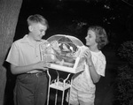 Phillip Reed Webster grinned to learn he'd hit the feathered jackpot in the Ark Fund love bird contest. His pair of love birds (smootchy as all get-out, one of the onlookers said) came with housing problem already solved. He won the cage too. Phillip is shown with his pair of love birds in their cage. An unidentified female youth is also standing next to the cage. Published in The Fort Worth Star-Telegram Morning Edition June 11, 1947.