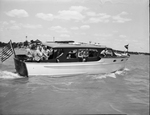 Waterway officials inspecting lakes around Fort Worth Texas. A picture of a group of men in a boat on a lake. The boat has the American flag attached to it. Most of the men seem to be wearing business attires. They are standing and some of them are under the canopy the boat has with their heads sticking out the window