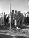 Benbrook Dam. Ground breaking. Mr. Amon Carter Sr. is standing in between two unidentified men and the three of them are holding a shovel and digging the ground. The man beside him on the left of the picture is also holding a wooden flag. The man on the left is wearing a long sleeve shirt and pants with a tie while Mr. Carter is dressed in a suit and tie with a hat and the man to the right is wearing his military uniform. Mr. Carter and the man to the right are also sticking opposite foots out in front of the shovel. There are people in the background watching.
