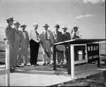 Benbrook Dam. Ground breaking. Mr. Carter Sr. and a group of men are standing at the deck of a river. Mr. Carter and another unidentified man are holding a shovel together. Some of the men are wearing suits, or long sleeve shirts with pants and a jacket while others are in their military uniform. They are all wearing hats and standing together. Some of the men are looking towards the camera while other are looking straight ahead based on where they are standing. There is a table with a microphone on it and a sign that says 'WBAP Fort Worth"