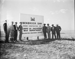Benbrook Dam. Ground breaking. A GROUP OF MEN ARE STANDING OUTDOORS AT THE SHORE IN FRONT OF WATER AND BESIDE A SIGN THAT SAYS "Benbrook Dam Under Construction by Corps of Engineers War Department Galveston Engineer District". There are about four men standing on the left of the sign and another four standing at the right. Some of the men are wearing suits, or long sleeve shirts with pants and a jacket while others are in their military uniform. They are all wearing hats and standing together as they pose for the camera. Amon Carter Sr. is present amongst the men