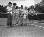 Children's tennis class at River Crest Country Club; Gib Davis, Billy Bob Watt, Cornella Cummins, Bill Cross, Jim Ludlum, Stanley Durham, 06/19/1947