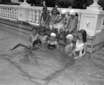 Pat Collins demonstrating swimming stroke to River Crest summer program group; l to r: John Loffland, Lucille Horn, Linda Lawrence, Carol Champion, Kaye Buck; on edge of pool Billy Eschenbrenner, Joy Linn Trentman, Christney Cloer and Courtney Cloer