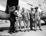 Prisoner of War reunion. Left to right, Governor Jester, General Wainwright, Captain Harry Harvey of Goose Creek, president of the Club, and Amon Carter Jr., reunion program chairman, and Lieutenant Colonel Thomas Dooley. They are standing in front of an airplane. Some of the men are wearing military uniforms while Mr. Carter and the first man on the left of the photograph are wearing suits and ties. Mr. Carter is also wearing a hat. Some of the men are looking towards the camera. The first man from the left is shaking hands with the third man from the left.