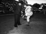 Fort Worth Cats vs.Beaumont Exporters baseball game. Bill Capps, Beaumont player after crossing home plate shows the umpire the part of his foot that touched the plate.