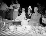 Prisoner of War party at Shady Oak Farm. There are a group of unidentified people seating on chairs with a table in front of them. They seem to be watching something. They are seated outdoors.