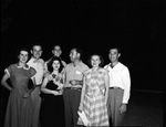 Prisoner of War party at Shady Oak Farm. A group of people are standing outdoors , There are four men and three women with Amon Carter Jr. included in the group. The women are wearing dresses and the men are wearing buttoned shirts with pants. They are all smi8iling as the pose for the camera.