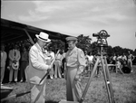 Fort Worth Army Air Field ground breaking for housing program. Amon Carter Sr. handing shovel to Brigadier General Roger M. Ramey. Both men are standing outdoors in the grass in front of a crowd standing under a canopy. Mr. Carter is wearing a suit and tie with a hat while Gen. Brig. Ramey is in his military uniform. Both men are looking at the shovel Mr. Carter is holding in his hand. In the background there is a telescope and a partial view of a wheel barrow.