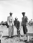 Fort Worth Army Air Field ground breaking for housing program. Amon Carter, left, and General Ramey at right (man in center not identified). The men are dressed in military uniform except Mr. Carter who is wearing a suit and tie with a hat. The unidentified man in the center is holding a shovel in the grass and is bent forward while the other two men stand beside him upright on each side. Mr. Carter and the man in the center are facing the camera and smiling while Brig. Gen. Ramey is looking down at the shovel. There are other people on the field at a distance in the photograph.