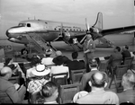 Christening of American Airlines Flagship Texas. The Flagship Texas, in the background. Amon Carter is speaking. Mr. Carter, master of ceremonies at the inauguration of American Airlines service to San Francisco is standing in front of a crowd and is addressing them using a microphone. In the background is the American Airlines Flagship Texas Plane. In front of Mr. Carter, there are different people seated in chairs listening to him speak. They are dressed in various attires while Mr. Carter is wearing a suit and tie. Mr. Carter is holding some documents in his hands which he is showing to the audience.