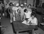 Golfer Carl Wade (seated) registers boys for the City Junior Golf Tournament including (front to rear) Courtney Wood, Dick Jetton, Wendell Waddle, Donald Brown, Kenneth Edwards, Frank Talley and Kenneth (Corky) Wade.
