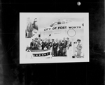 Copy of a picture Left to right, City manager W. O. Jones, William Holden, Fred H. Korth, Fort Worth; Melvin J. Miller, Fort Worth C. of C. president; Raymond E. Buck , Mrs. Korth; Brigadier General Roger M. Ramey, Dr. Hodges McKnight; Amon Carter; Mayor Edgar Deen of Fort Worth; Robert D. Harrell Major General C. R. Smith and Colonel Allen D. Clark at the Dedication of City of Fort Worth,' a B-36. In the photograph people are standing in front of the airplane and there are insert photograph showing General Ramey speaking using a microphone and Amon Carter removing a sealed cover from the plane.